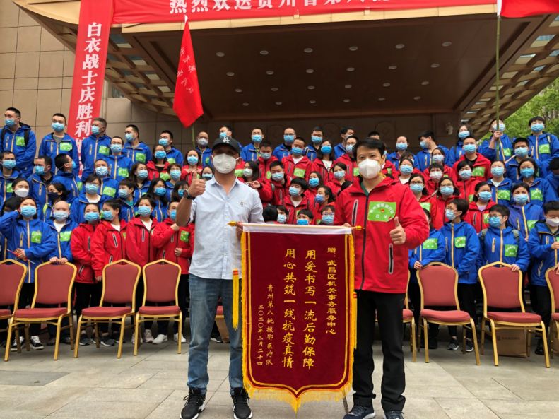 3月25日上午,贵州第八批援鄂医疗队临行前给武昌区机关事务服务中心送来一面锦旗:用爱书写一流后勤保障,用心共筑一线抗疫真情!对中心全体工作人员一个多月优质、热情、高效的后勤保障服务表示感谢。