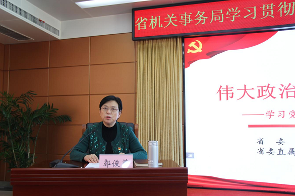 12月27日,省机关事务局举办学习贯彻党的十九届六中全会精神专题读书班,省委宣讲团成员、省委直属机关工委常务副书记郭俊苹特邀作专题宣讲报告。局党组书记、局长管俊主持开班式并作动员讲话。